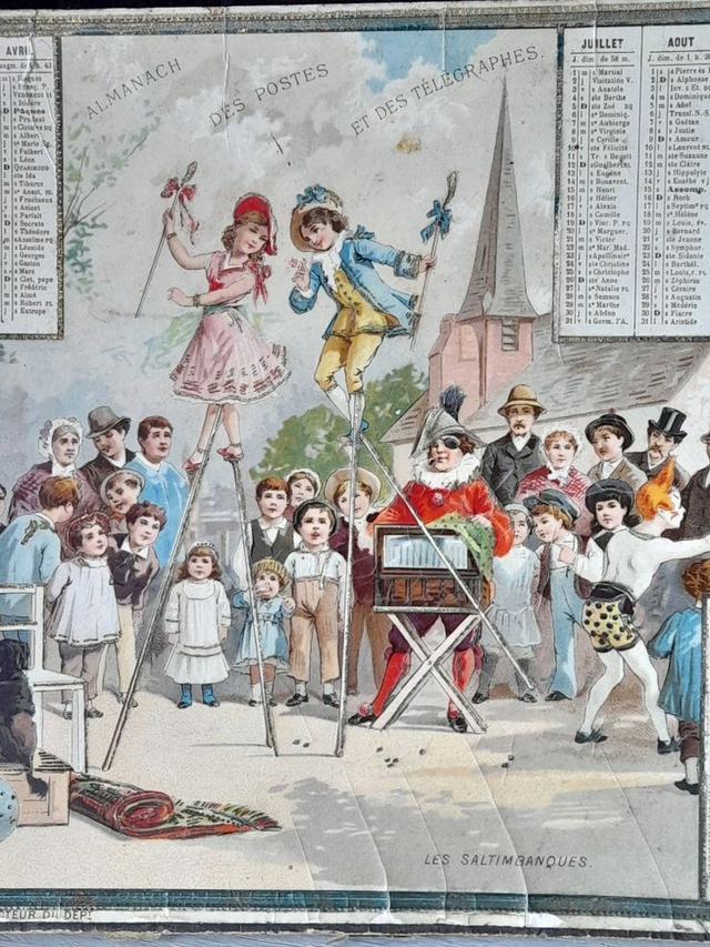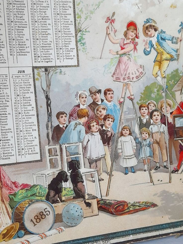 La scène centrale représente un spectacle forain avec enfants et artistes, entourée des calendriers mensuels imprimés en français.