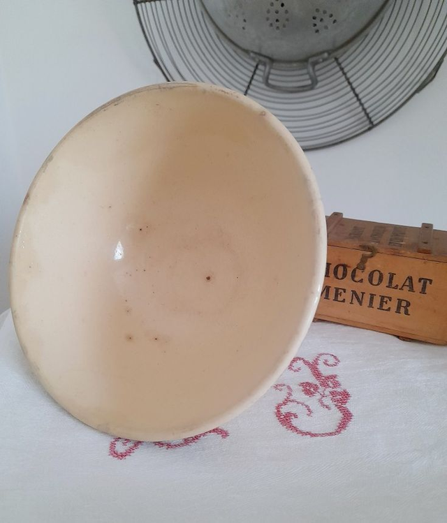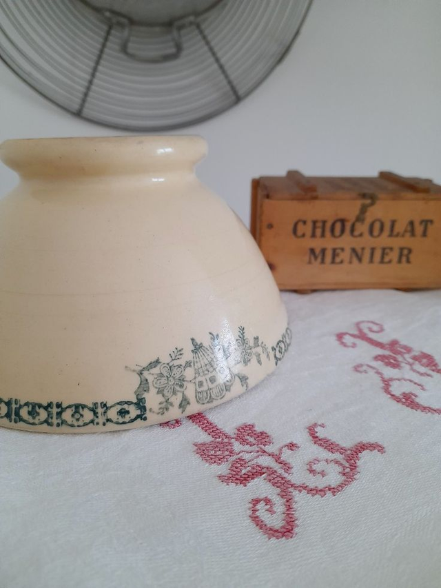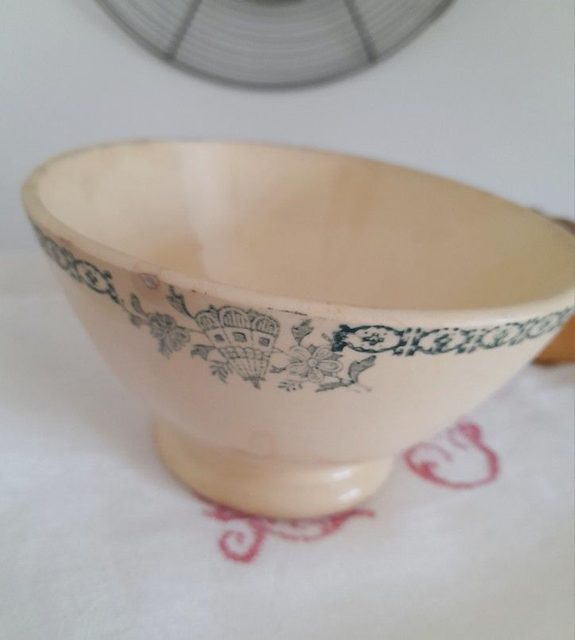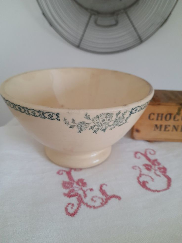 Bol ancien en faïence, décoré d'un motif floral bleu vert sur fond crème