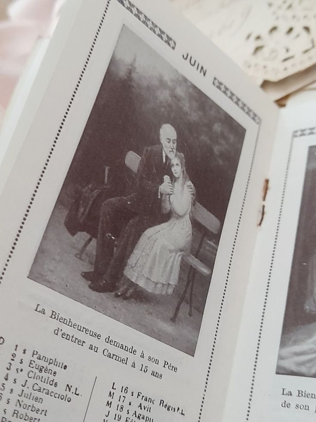 Pages de calendrier mensuel avec illustrations pieuses de Sainte Thérèse, accompagnées des dates et fêtes