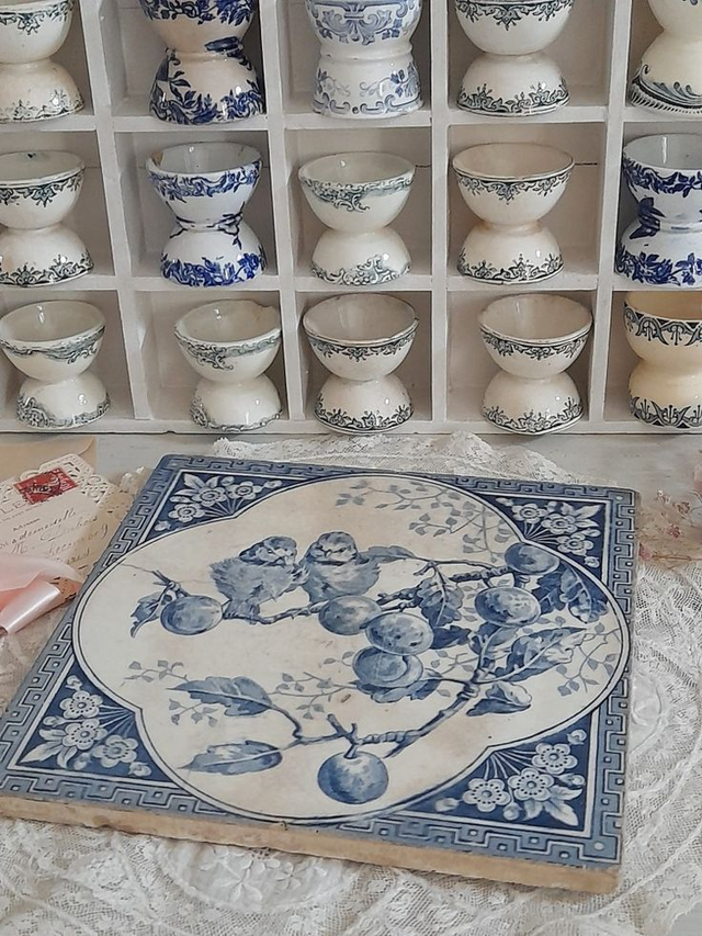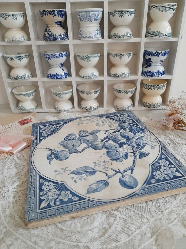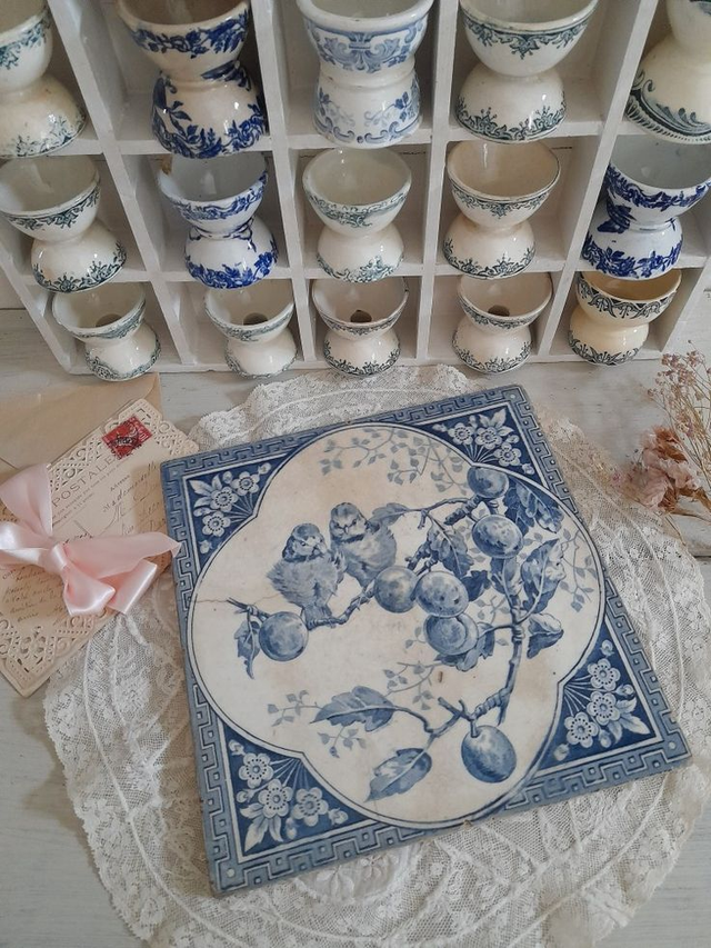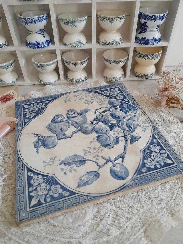 Décor d'oiseaux perchés sur une branche fruitière, entourés de feuillages, dans un médaillon encadré d’une frise florale et géométrique