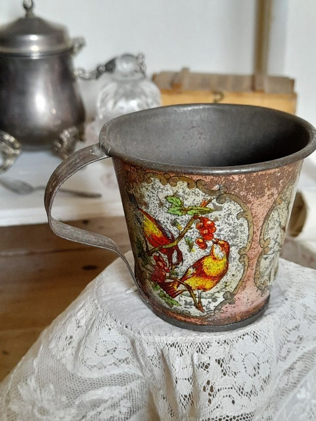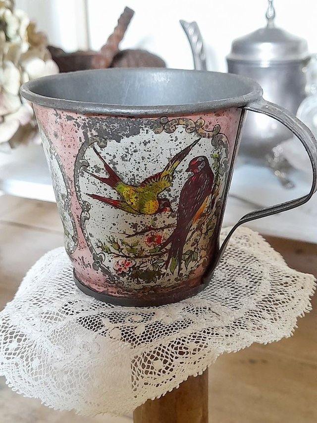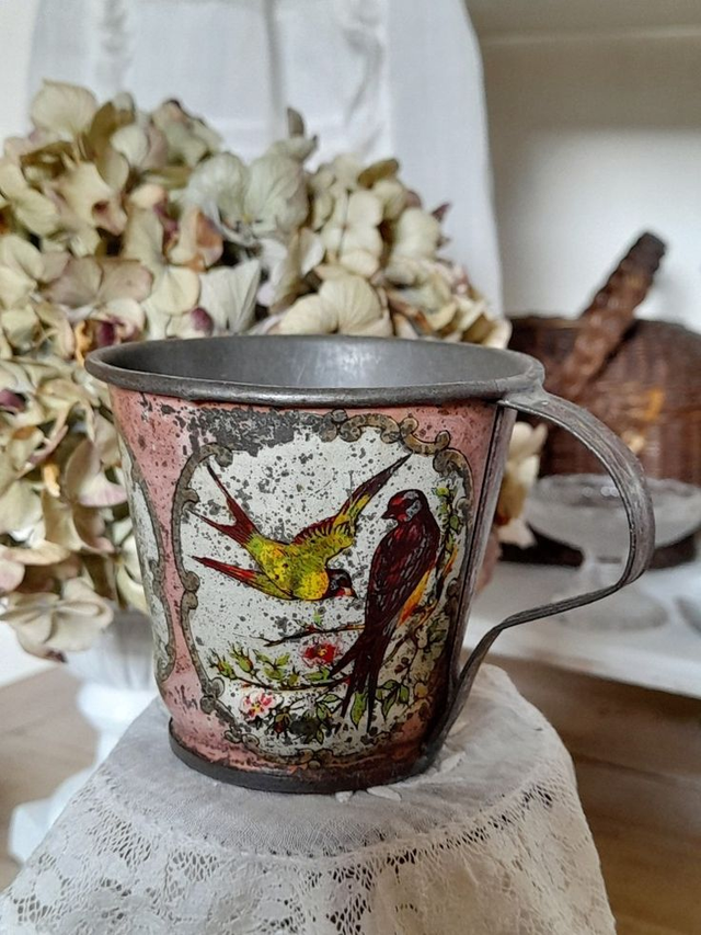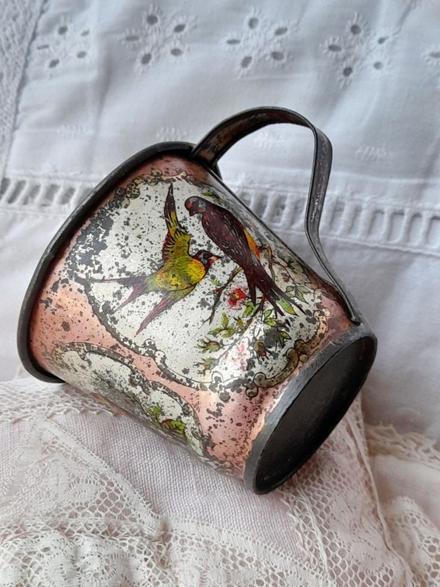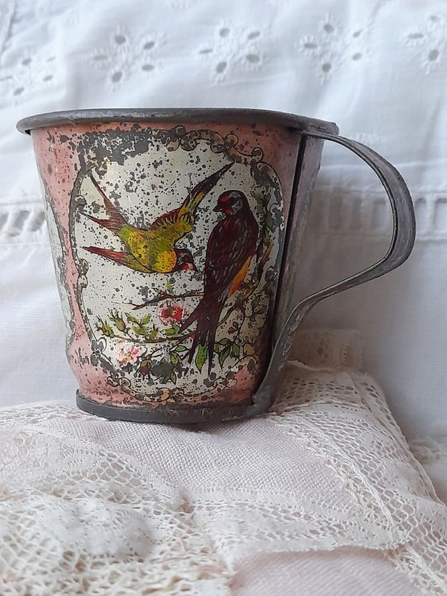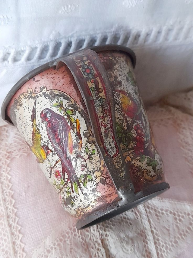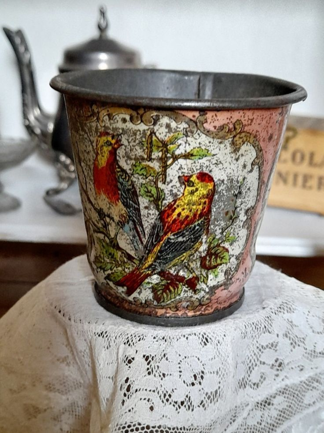 Gobelet ancien aux oiseaux en tôle lithographiée