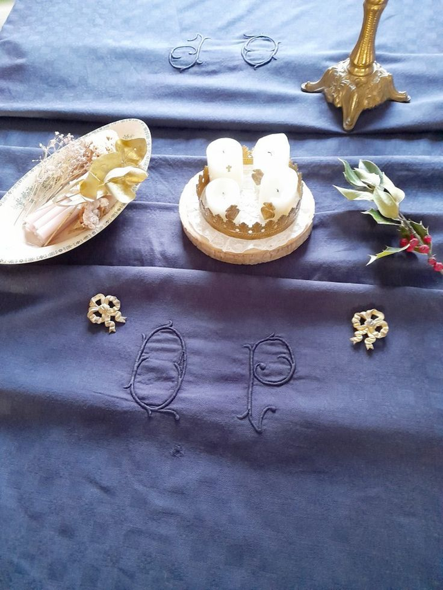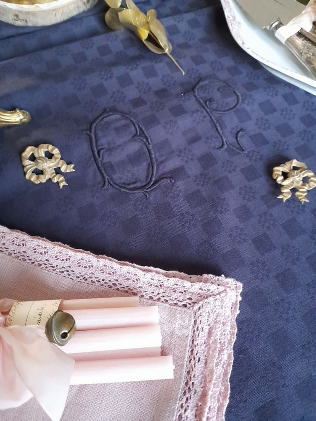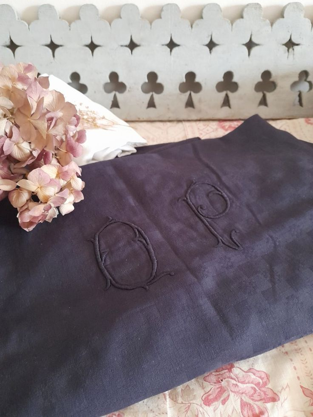 beau linge de maison ancien, authentique, parfait pour une table de campagne chic, en superposition d'un autre linge ancien