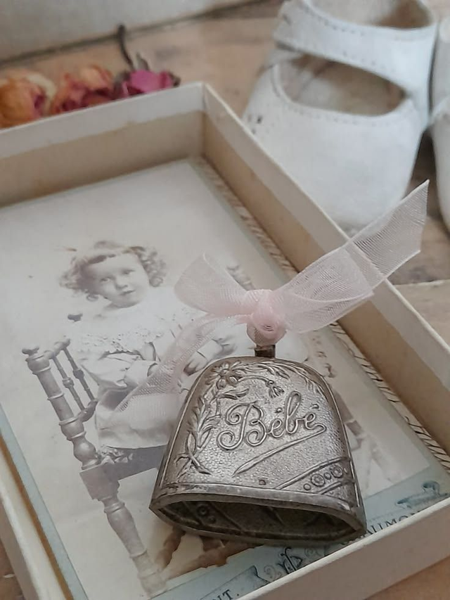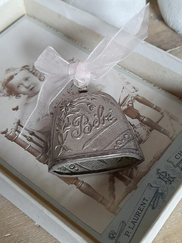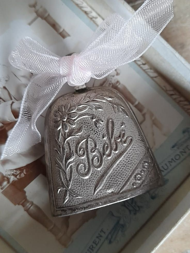 Charmant petit Hochet ancien “Bébé” de berceau en métal argenté