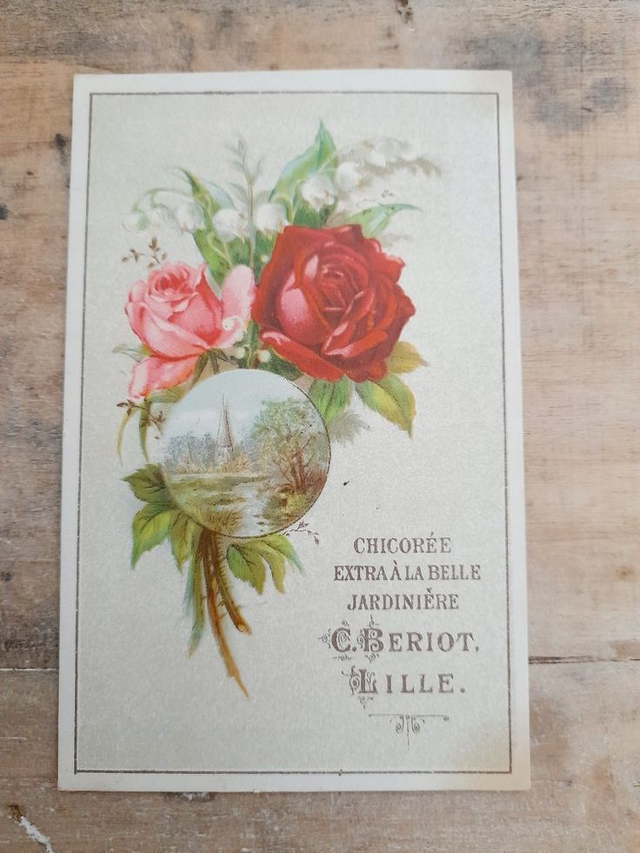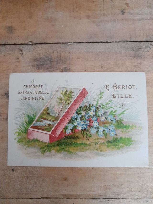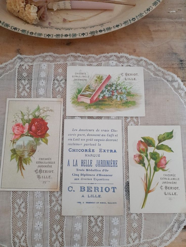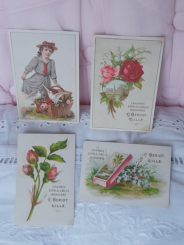 Joli lot de 4 chromos publicitaires anciens pour la Chicorée extra à la Belle Jardinière – C. Bériot, Lille.