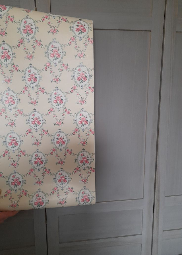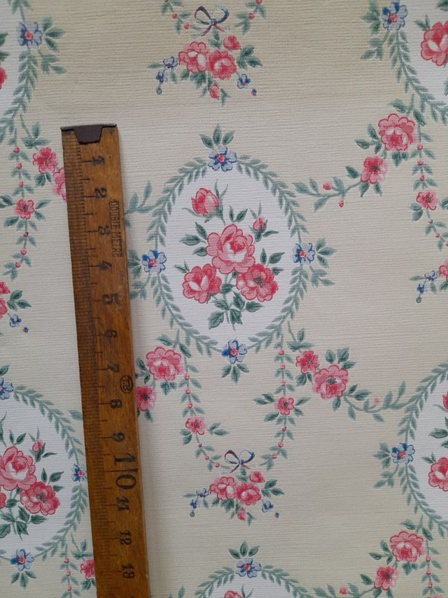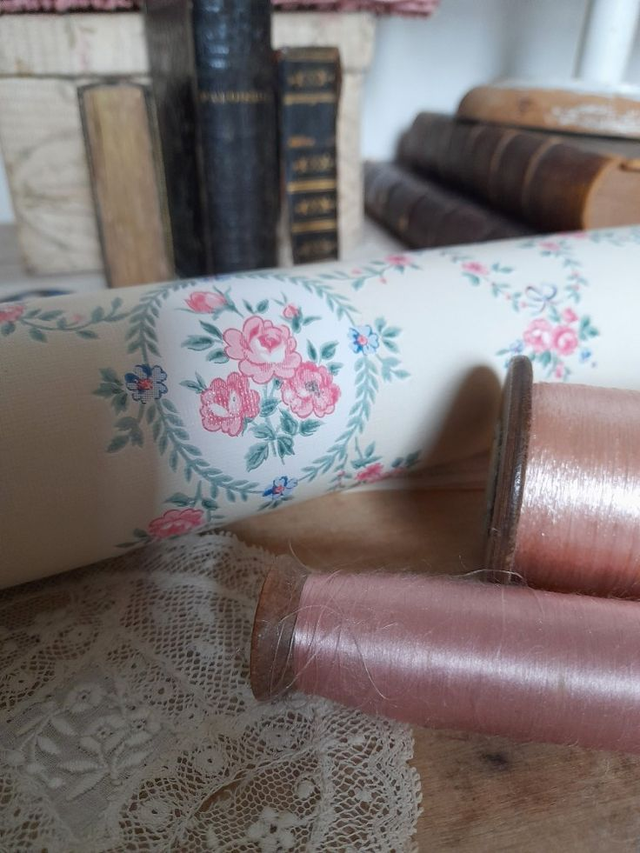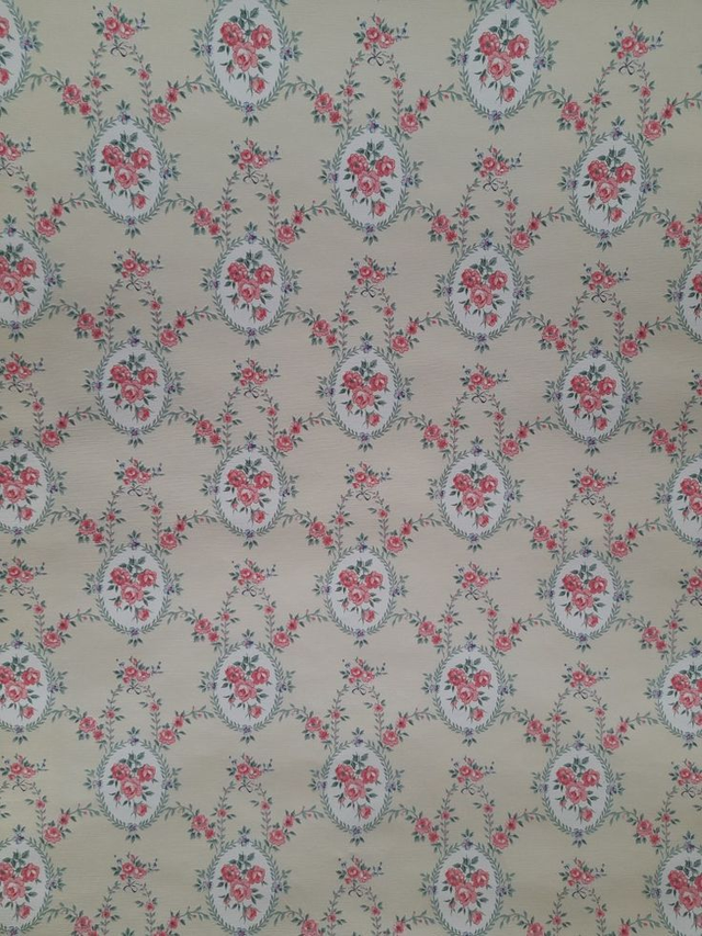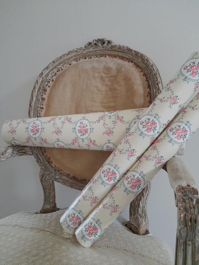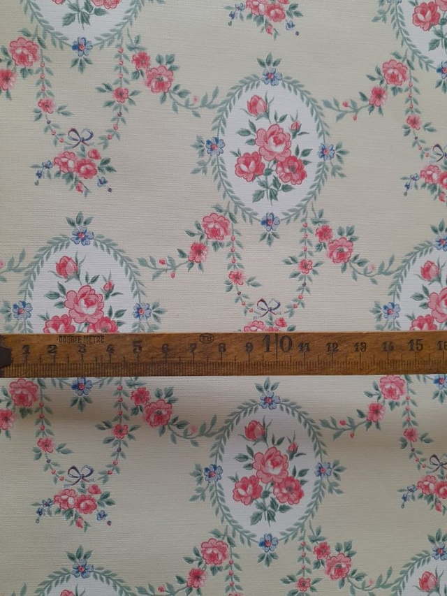 3 Rouleaux anciens de papier peint vendus à l'unité orné de médaillons floraux de roses, guirlandes feuillagées et petits nœuds,