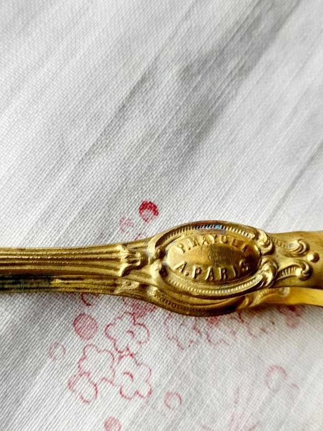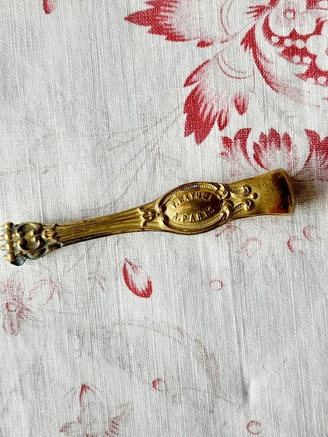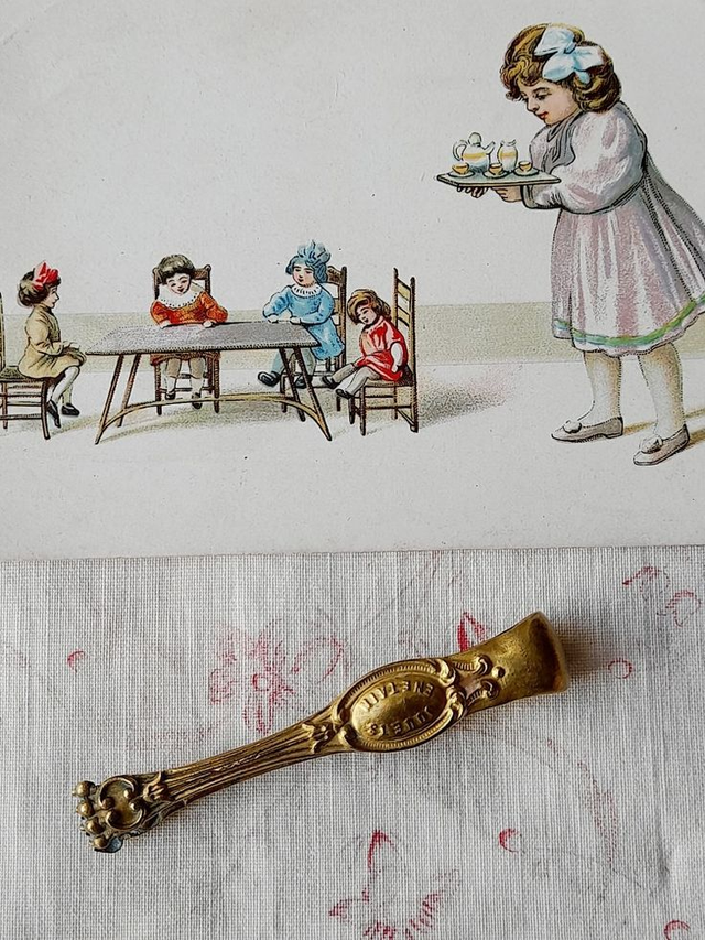 Jouet ancien – dinette – pince à sucre miniature – jouets en étain – patine dorée – Paris – Belle Époque – maison de poupée – collection –