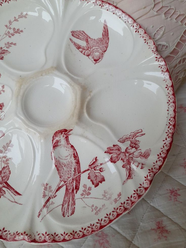 Charmant plat ancien à huîtres en faïence, à décor « oiseau et fleurettes »