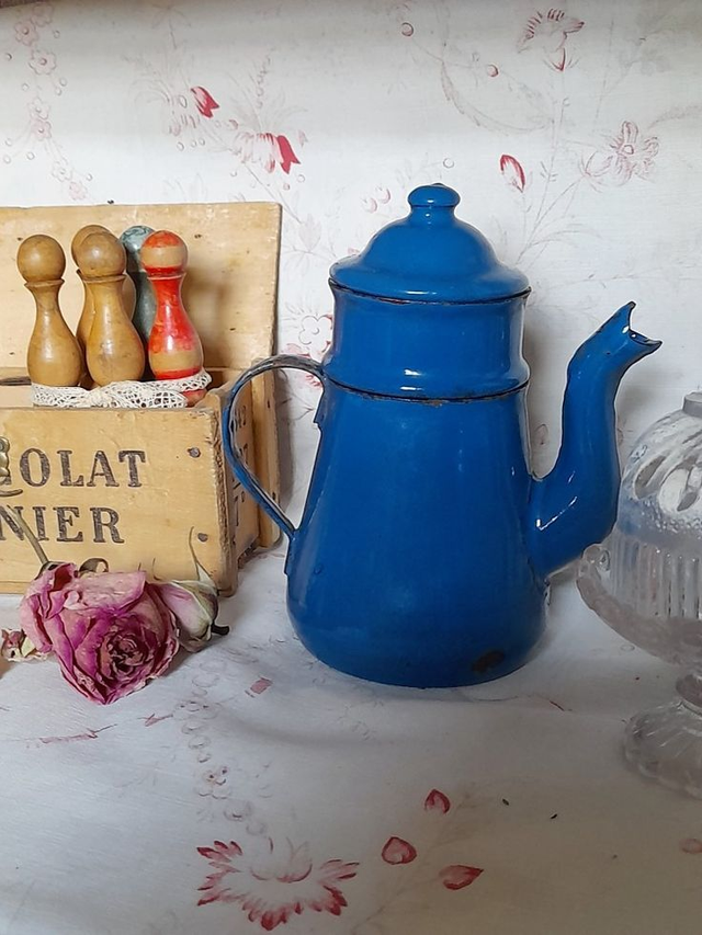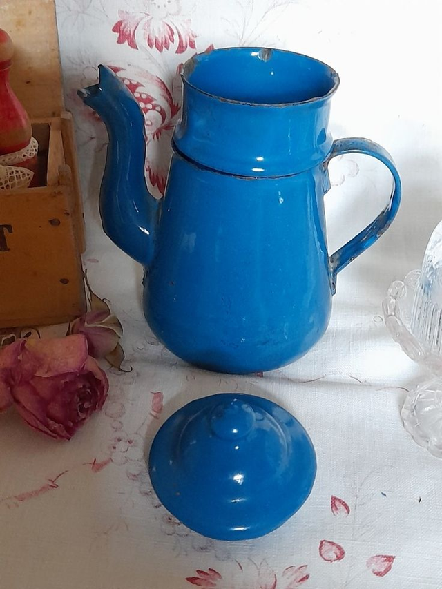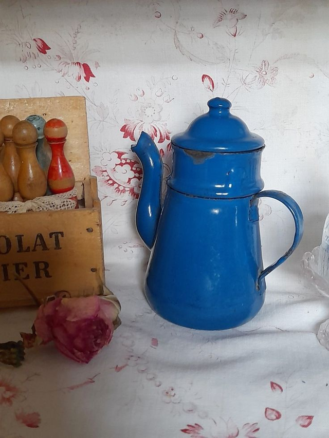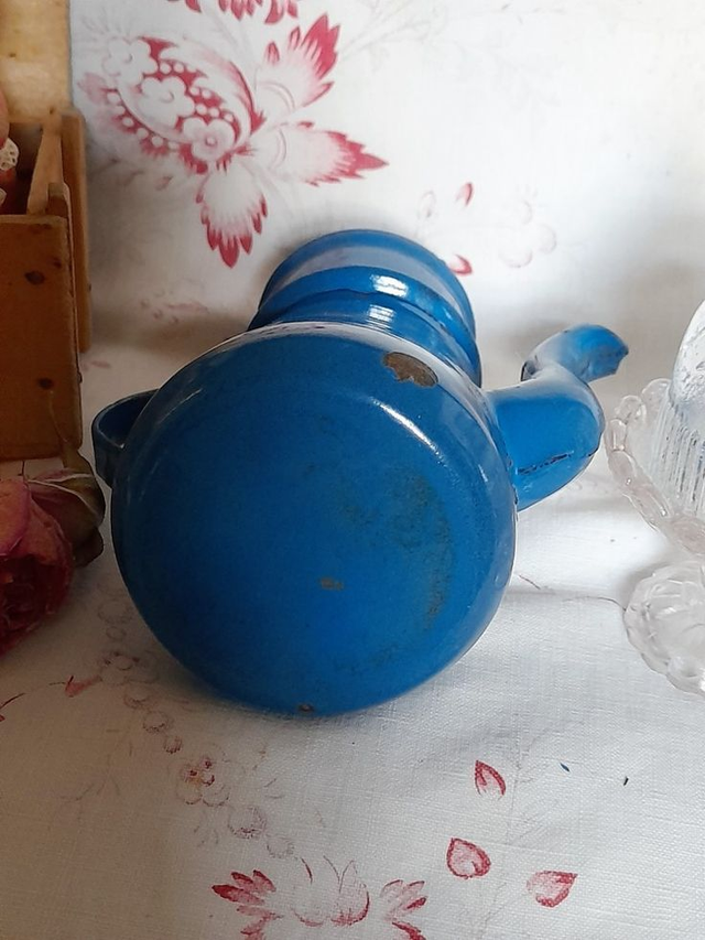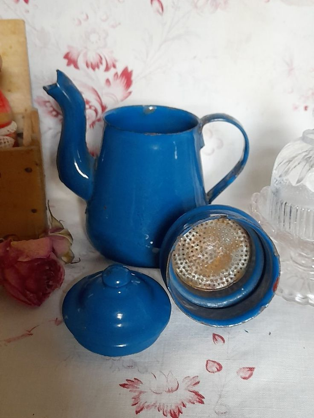 Ancienne cafetière miniature complète pour enfant, jouet émaillé bleu foncé