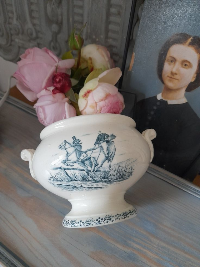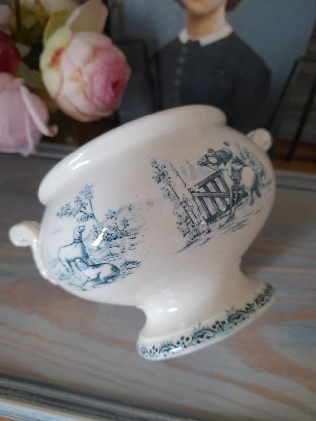 En faïence bleue, très bel état et belle brillance, décor intact, jolie scène champêtre de chiens, chevaux et cavaliers