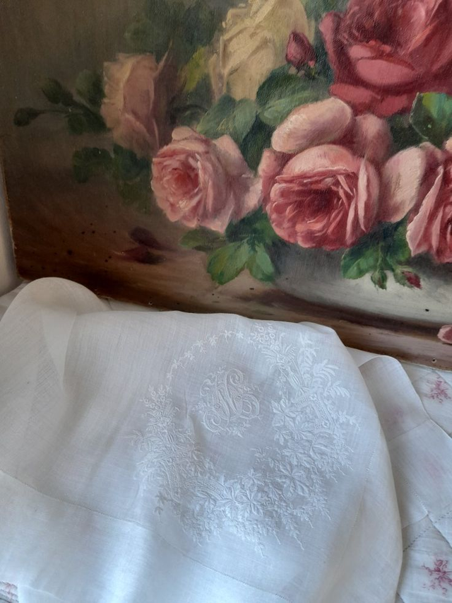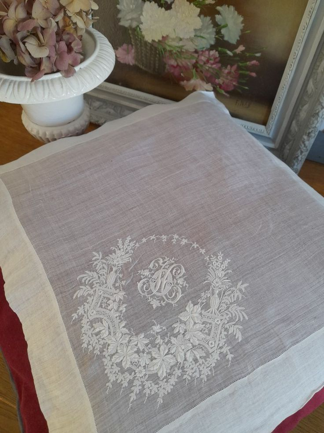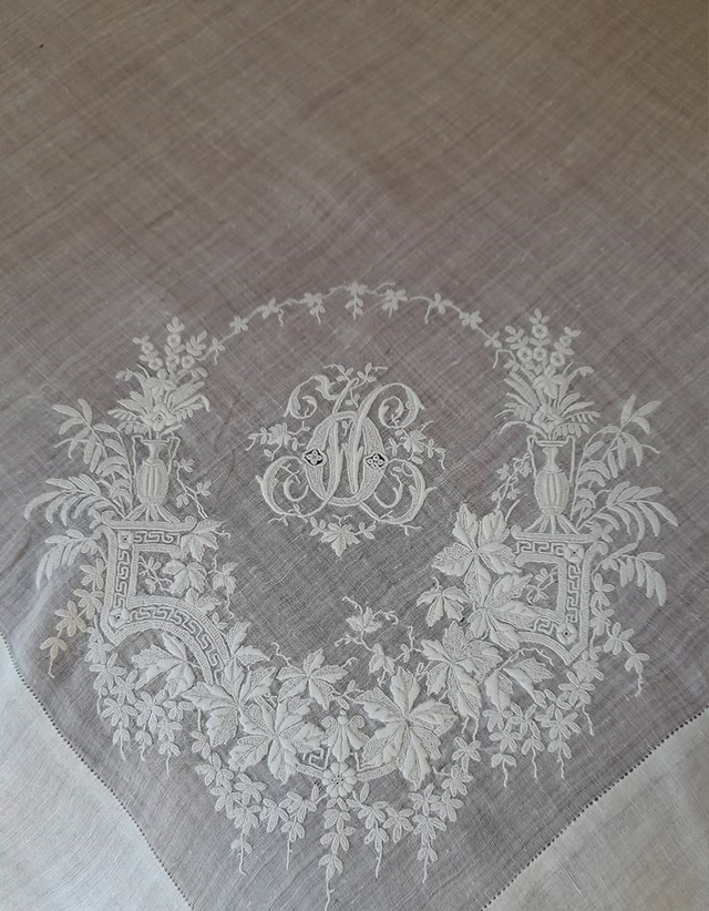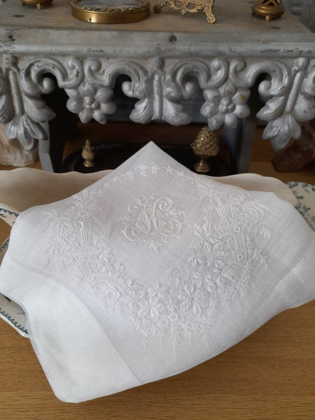 La broderie blanche présente une couronne de feuillage, fleurs et rubans, encadrant ces initiales.