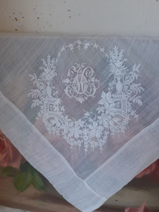 Magnifique mouchoir ancien en batiste de lin très fine, entièrement brodé main d'un monogramme richement orné "I" ou "J" et " C".