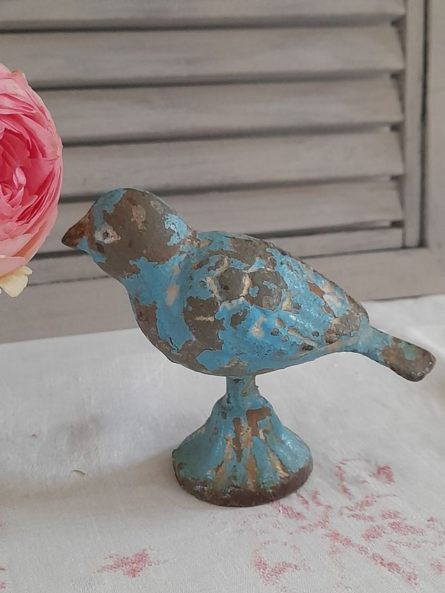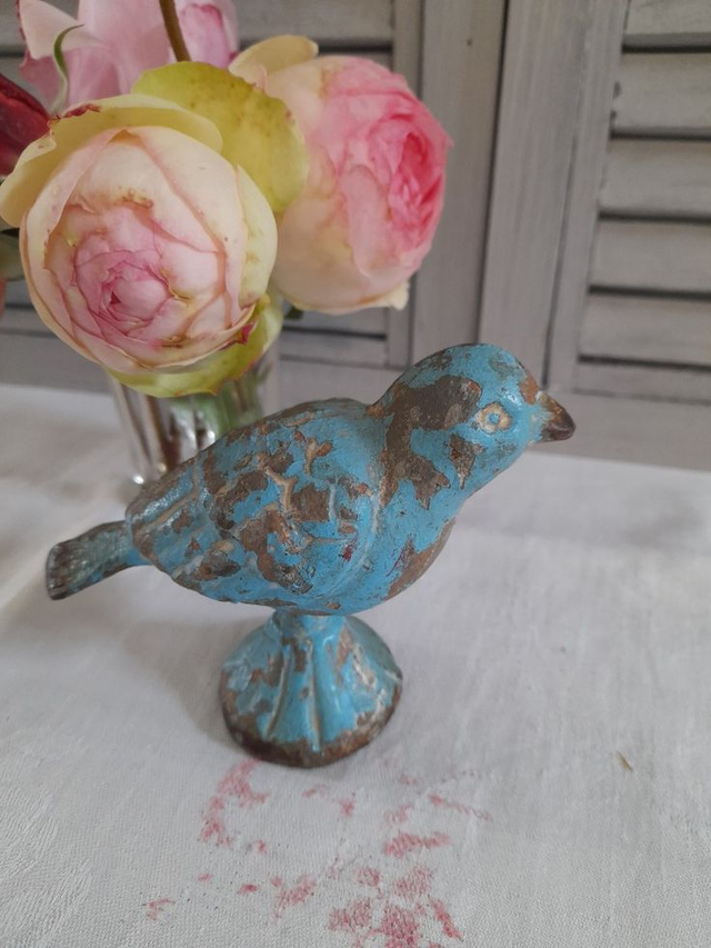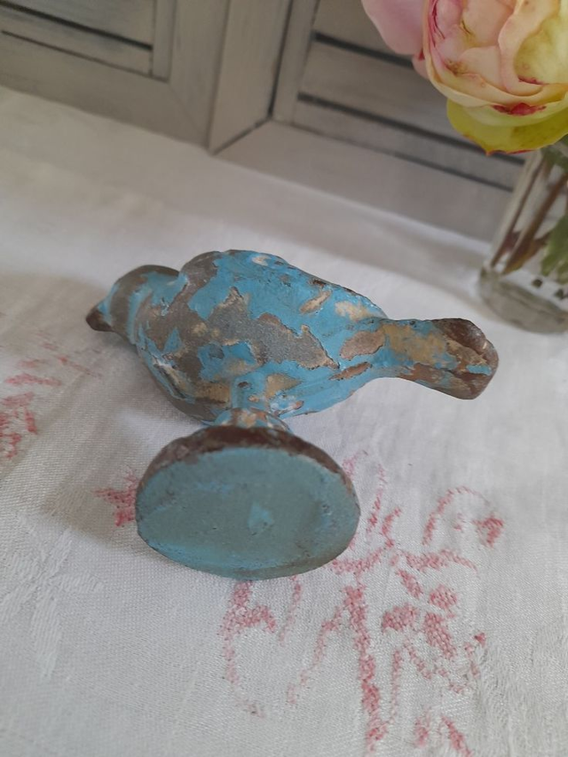 Adorable oiseau ancien en fonte à la jolie patine bleue d'origine