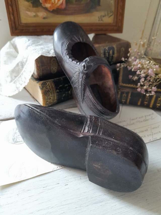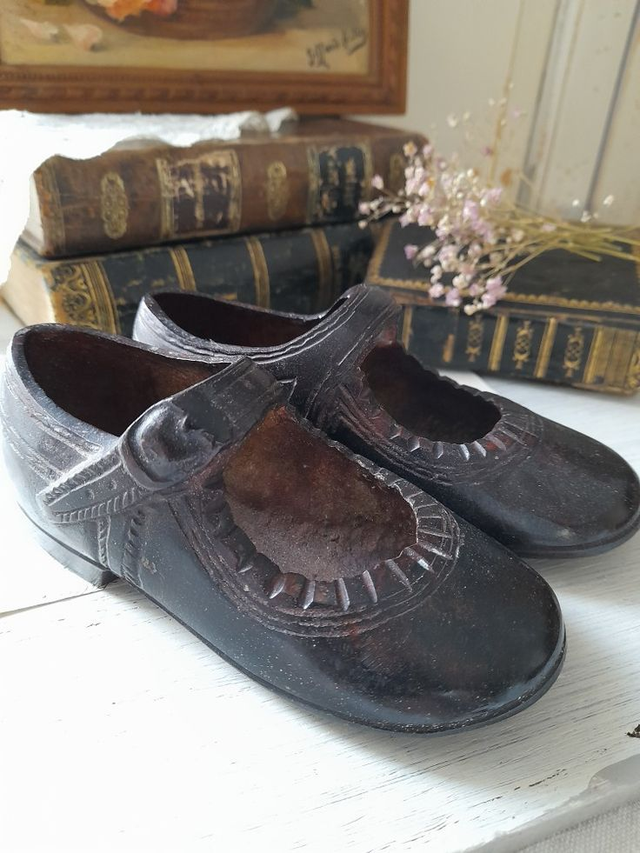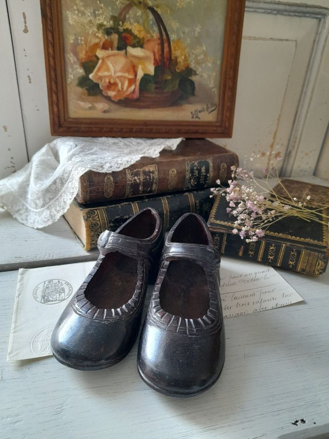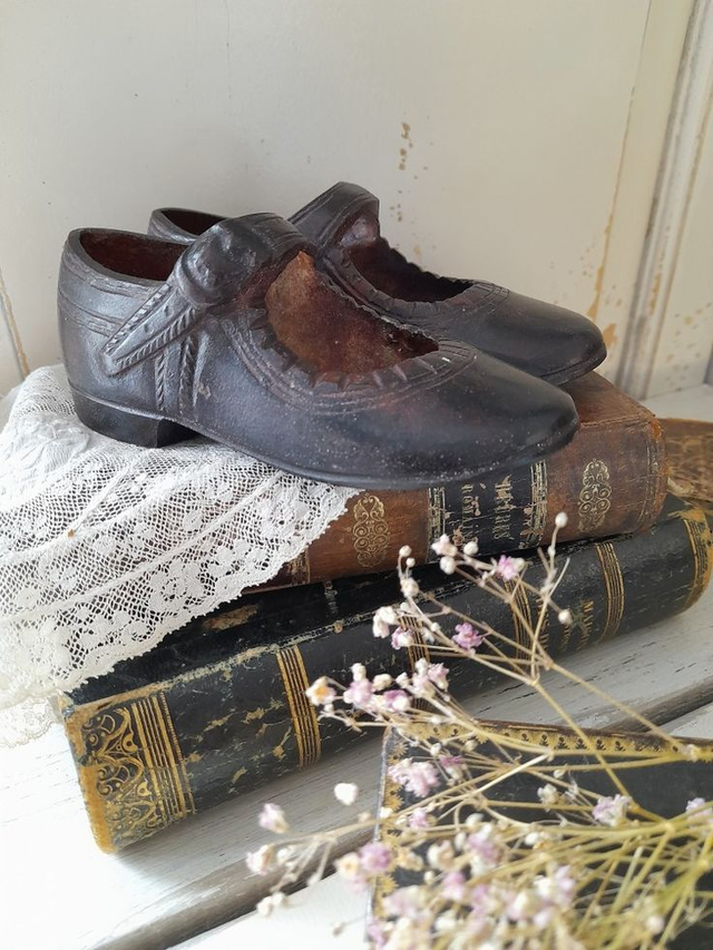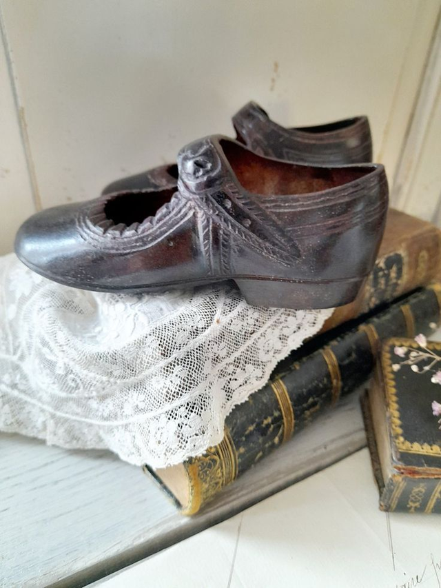 Paire de souliers d'enfant en bronze avec superbe patine d'origine coloris brun roux