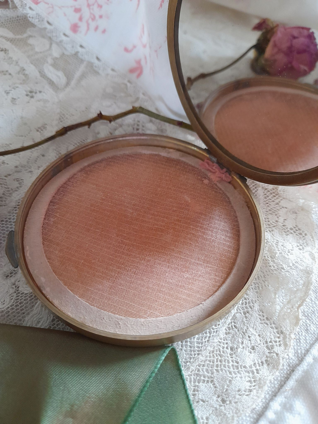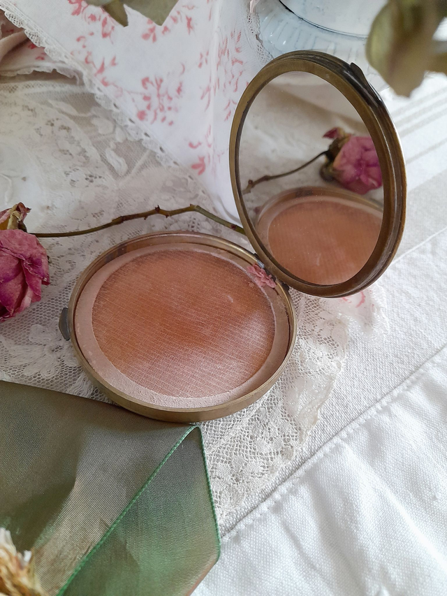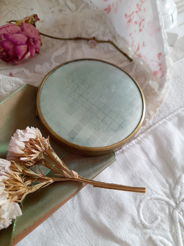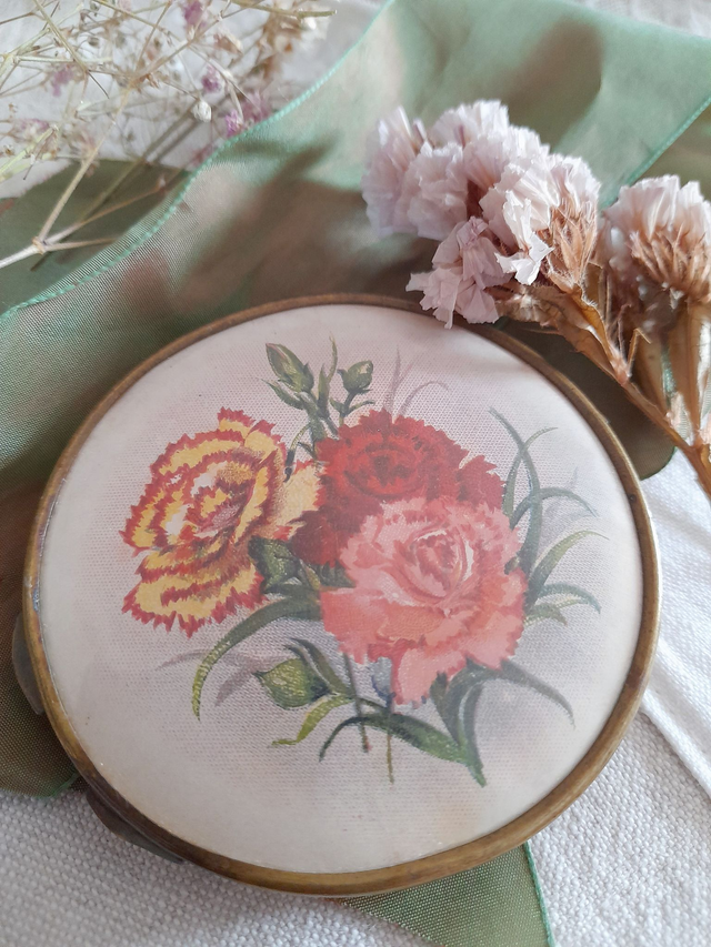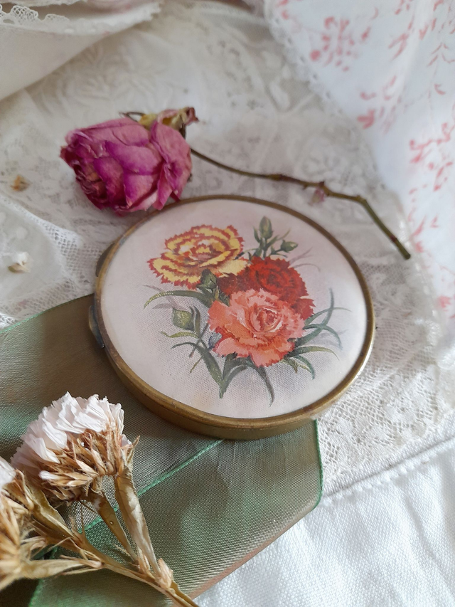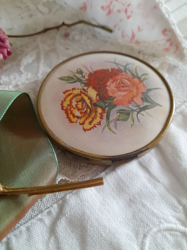 Charmant poudrier ancien des années 40, au couvercle orné d'un délicat motif d'œillets