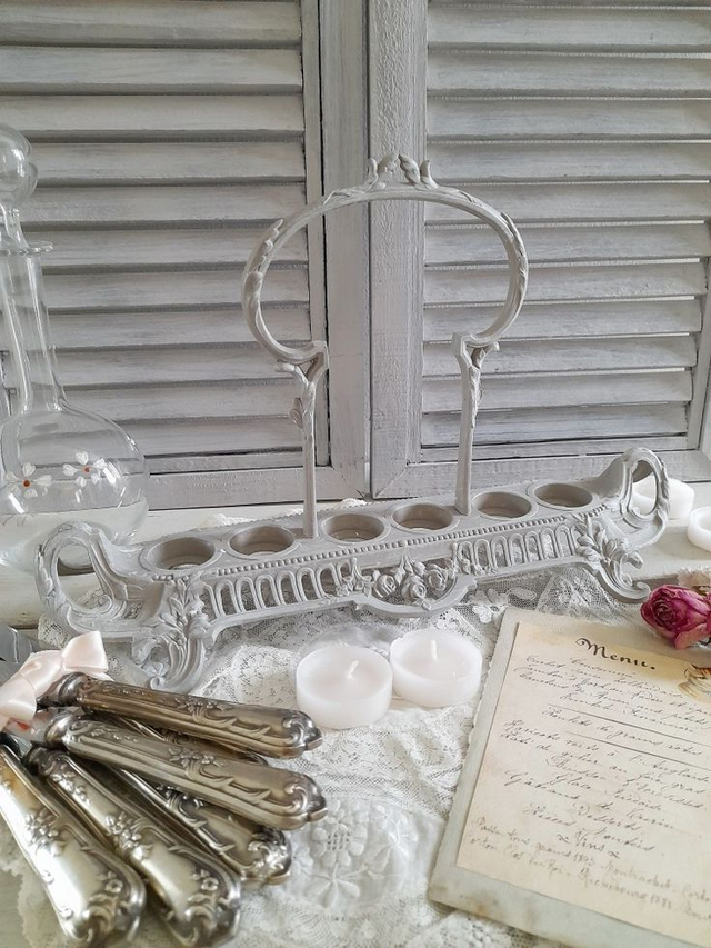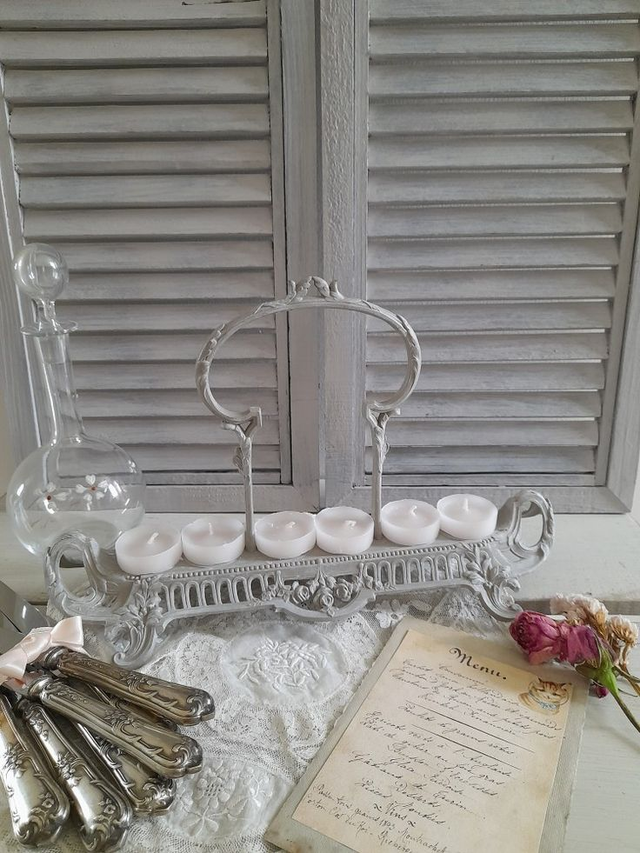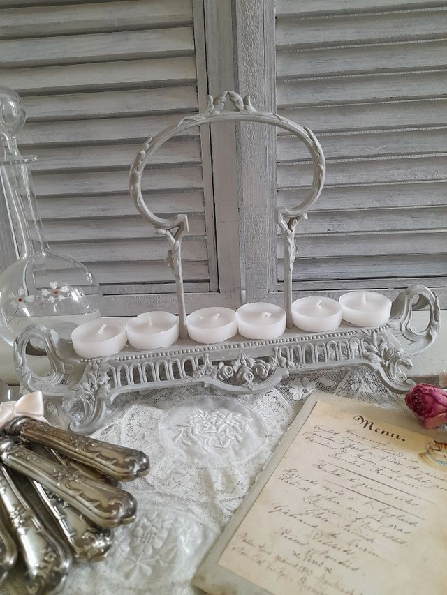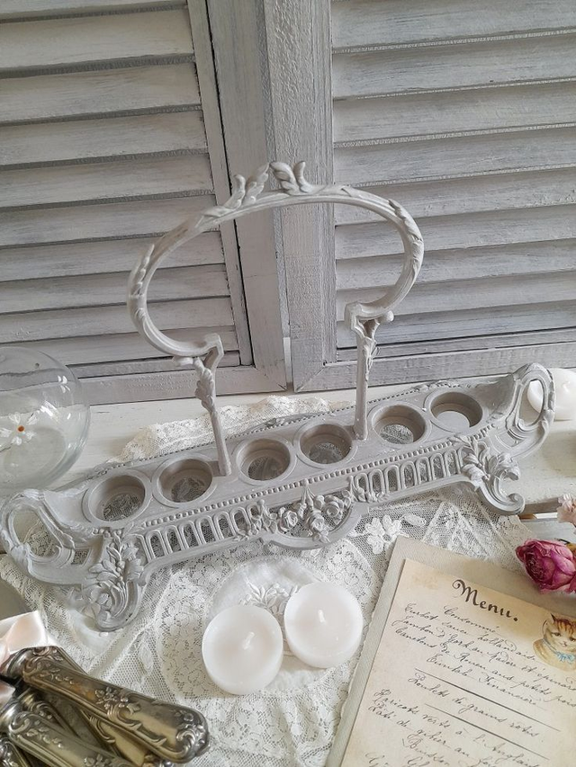 Présentoir ou serviteur ancien en régule peint en gris et patiné à la cire blanche